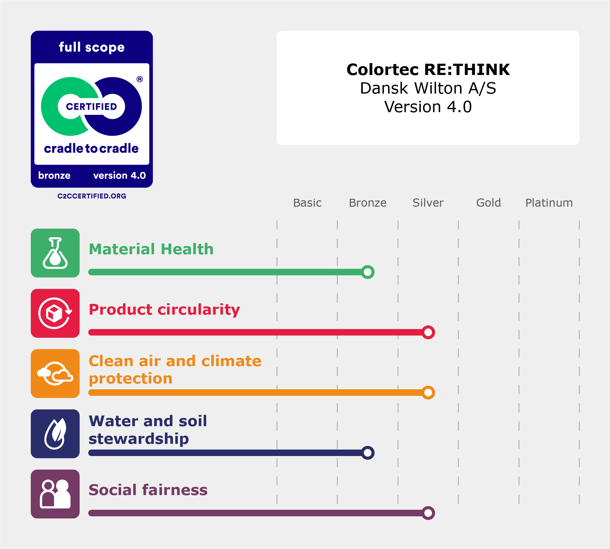 Colortec RE:THINK with our integrated felt backing made from 80% recycled PET bottles holds the Cradle to Cradle certification on Bronze level.
