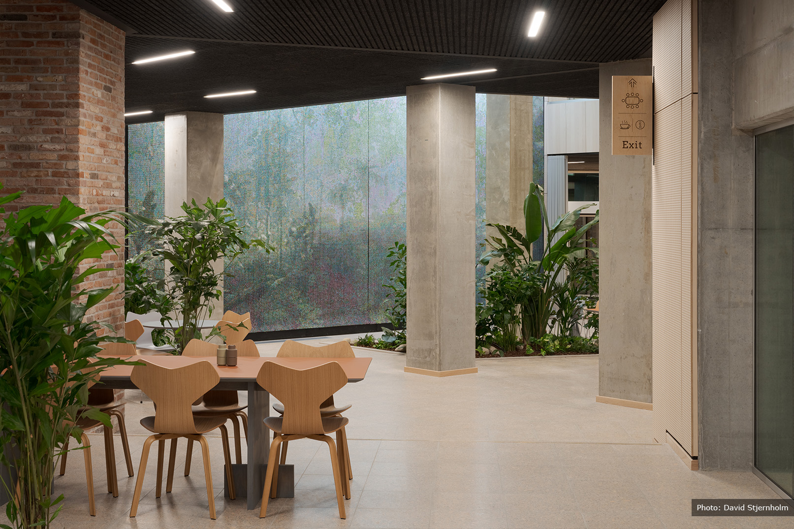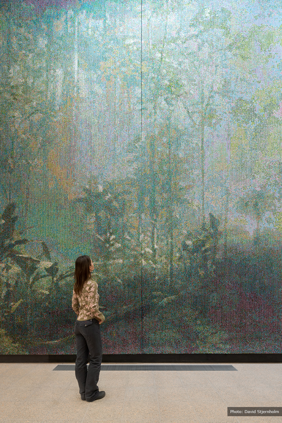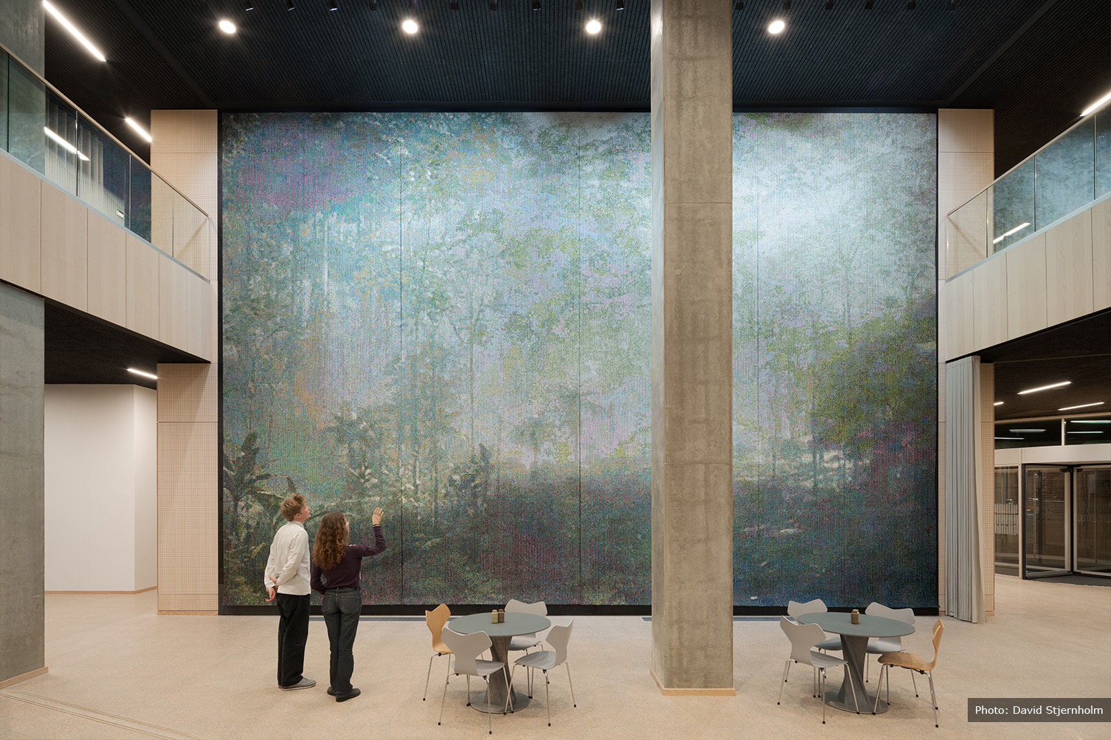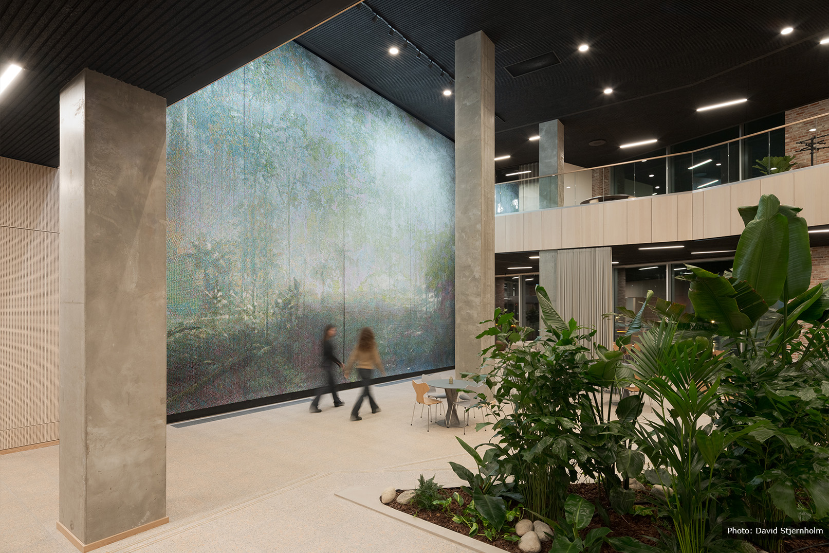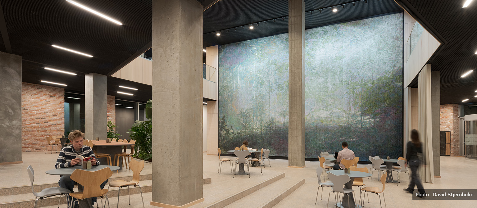 As the real estate developer, Skanska has created a unique dialogue between the artwork and the architecture. The central atrium, a focal point of the space, has been specifically designed to complement this magnificent piece. The large, open wall allows the artwork to be viewed from multiple floors, with every angle offering a new perspective, much like navigating through a jungle temple. The design ensures that, whether seen in passing or studied in detail, the artwork provides a profound experience.